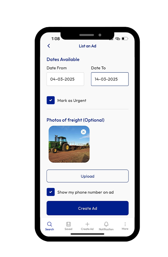 To get started, simply download the app from the app store and create a user account. The app connects freighters (individuals or businesses) with carriers for transportation. Here’s how it works: Freighters create an ad to advertise freight that needs to be moved from Point A to Point B. Freighters can enter details about their freight in the ad and upload photos for carriers to view. Once the ad is posted, potential carriers will review it and contact the freighter with their pricing and availability. It’s the freighters responsibility to remove the ad once the freight has been successfully moved.
